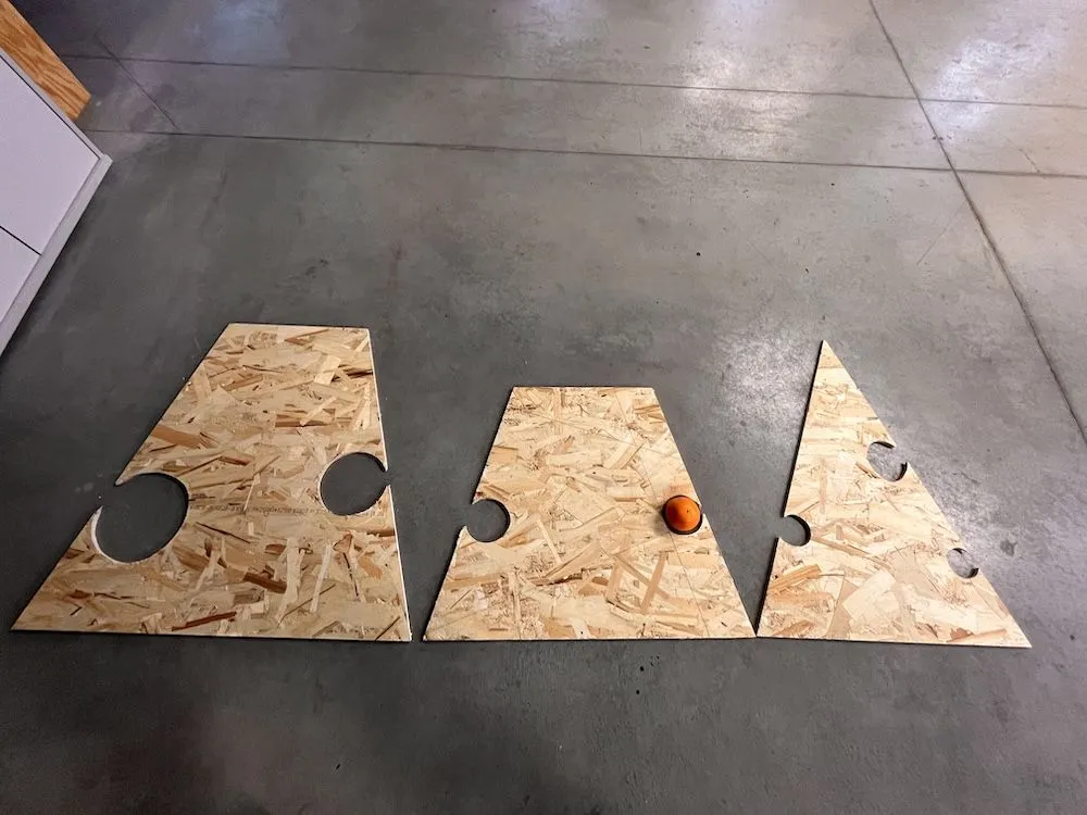 На листе фанеры разметьте 3 треугольных или трапецевидный фигуры, так чтобы ширина основания у каждого из них отличалась на 10 см от предыдущего. Это позволит создать силуэт елки, сужающийся кверху. Например: