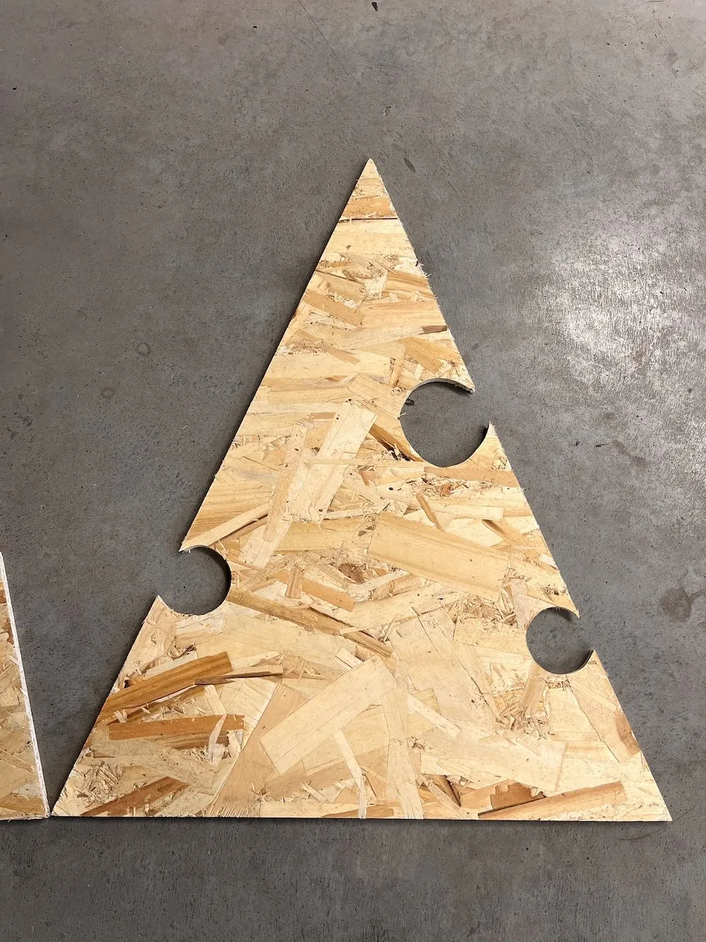 На каждом элементе разметьте круговые пропилы для елочных игрушек. Пропилы должны находиться на разном уровне. КОличество пропилов и их расположение размечайте на ваш вкус. Мы сделали 2 пропила в нижнем и среднем элементах, и 3 пропила в верхнем треугольнике. Так чтобы на елке можно было подвесить 7 елочных игрушек.